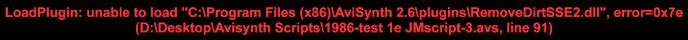 Changing the LoadPlugin line from RemoveDirtSSE2.dll to RemoveDirt.dll does not help either.
