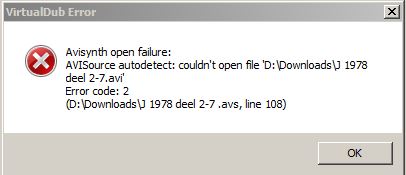 I think "error code 2" means no file with that filename was found. Check the full path and filename of your video file.Last edited by jagabo; 2nd Sep 2015 at 18:30.