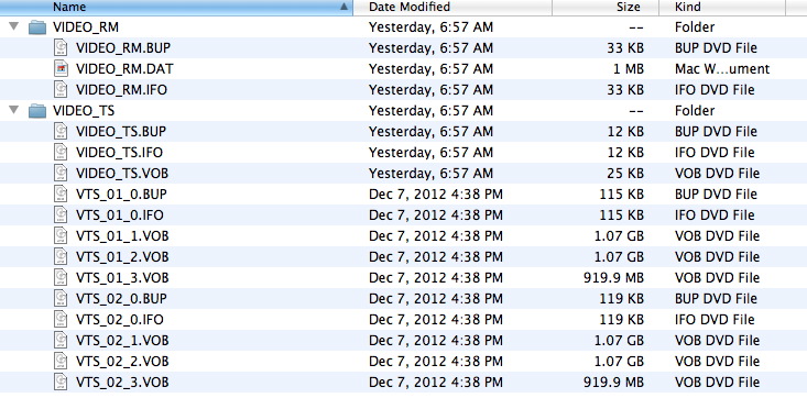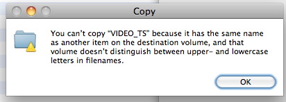 Hopefully I'm posting in the correct forum. I use a Toshiba D-VR610KU unit to transfer VHS tapes to DVD. It is a realtime encoder. I typically record to DVD+RWs and then copy the Video_TS folder to my hard drive and burn a permanent dvd-r from there. This process has worked fine for years. I have a vhs tape that was recorded in xp mode, so it has about 4:08 worth of material on it. I changed the record mode of the Toshiba to EP which allows 6 hours to be burned to dvd. I know its a huge quality hit, but it's fine for this content. When I pop the finalized dvd+rw into my mac it tells me that the video_ts folder is 6.14gb, which obviously is impossible. It seems like the VTS is getting duplicated in terms of what the computer thinks is in the folder. When I try to copy the video_ts folder to my mac I get the error message here: