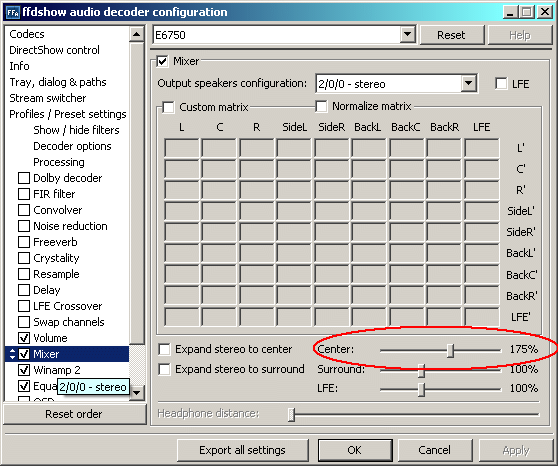 One thing I seem to have forgotten to mention in that thread.... I use ffdshow's mixer filter to downmix 5.1ch audio to stereo, and I set it to boost the volume of the centre channel, given that's where the dialogue tends to be.