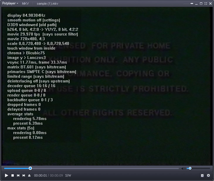 If you select Ctrl+J while a video is playing you'll be provided with statistics regarding playback (use CTRL+J again to disable them). It works for all renderers in MPC-HC, although they supply different information. MadVR is the most informative. CTRL+R should reset statistics such as the dropped frame count. It pays to start a video playing, let it settle for a second or two, then use CTRL+R to reset the renderer info while the video is playing.