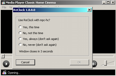 The ReClock message looks like this. It should pop up the first time you open a video file containing audio if ReClock is installed and working. If it doesn't.... well to be honest I've never had to worry about that. It's always worked for me.