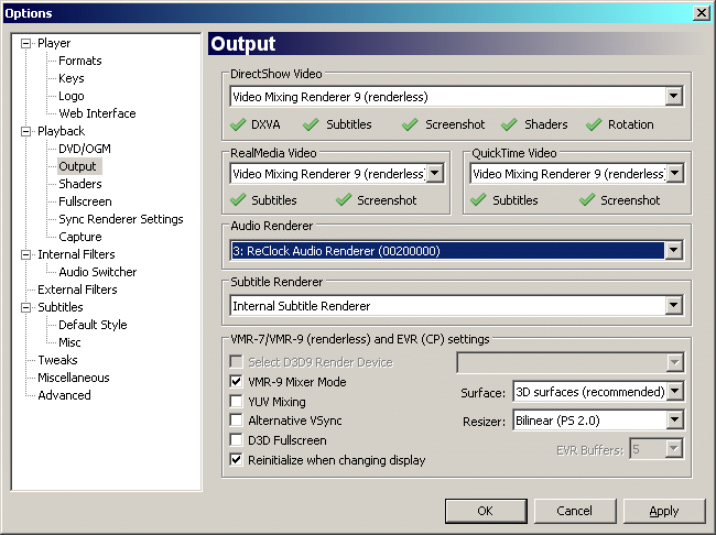 Anyway.... Reclock also has an option to reverse PAL speed-up. For 24fps film that's been sped up to 25fps PAL, you can tell ReClock to slow it down again. I do the opposite though and tell ReClock to speed 24fps up to 25fps and just leave my TV set to Refresh at 50Hz. I think the reason I decided to do it that way was because the player only tells the TV to change refresh rate when the video is running in fullscreen mode, plus I was having an issue with the old video card drivers crashing now and then when the player changed the refresh rate, so I do it the other way around.