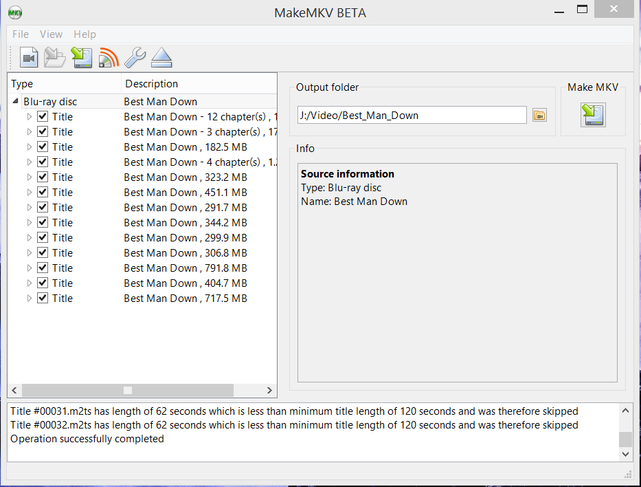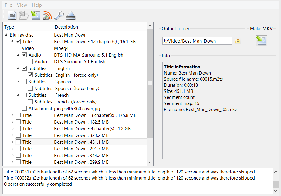 At this point, you would click on the box with the diagonal green arrow in it to "Save selected titles" to .mkv format in whichever folder you selected as the output destination. -