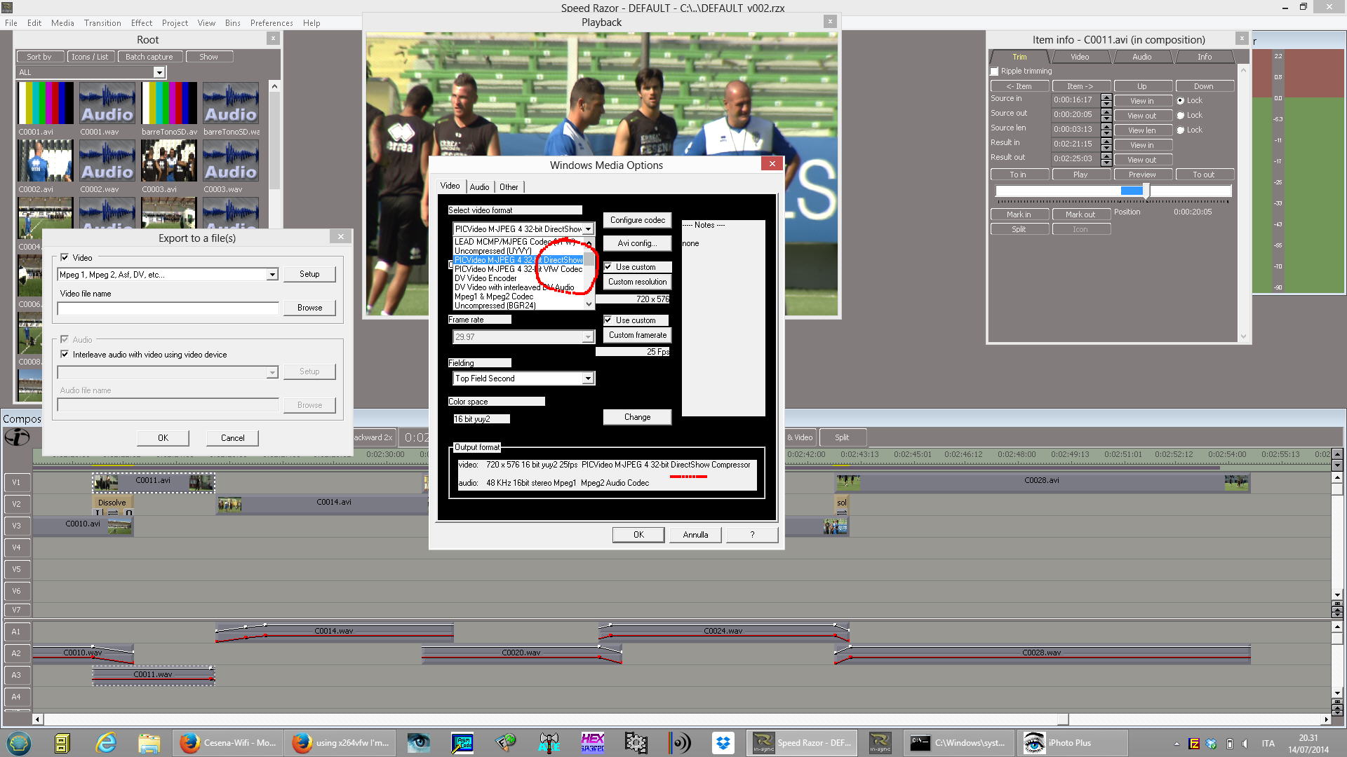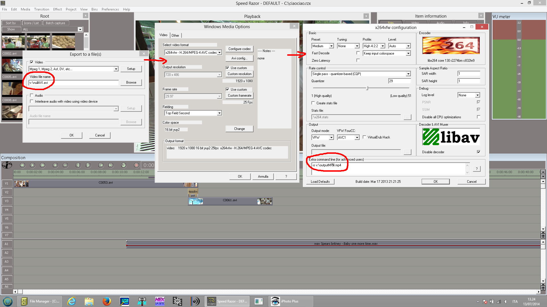 2) I my beautiful dinosaur Spee Razor 5.51 in sync super professional NLE editor (for cats) I have select the "Mpeg 1, Mpeg2, Asf, DV, etc..." plugin that recall a the list of VFW codec installed on the system. Exist a way to pass the output stream of the NLE directly to ffmpeg, as and external encoder?