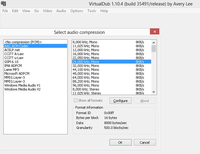 There is no such thing as "VfW audio", you meant *ACM codec*