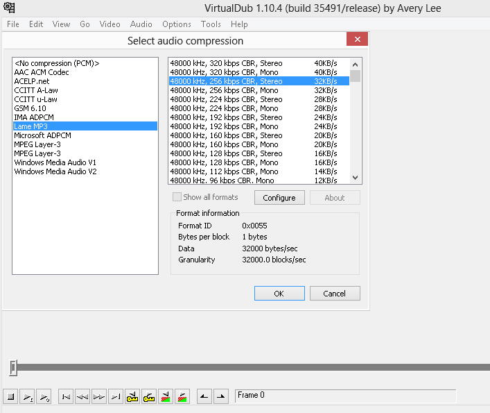 In VirtualDub, menu "Audio", item "Full processing mode", then "Compression".