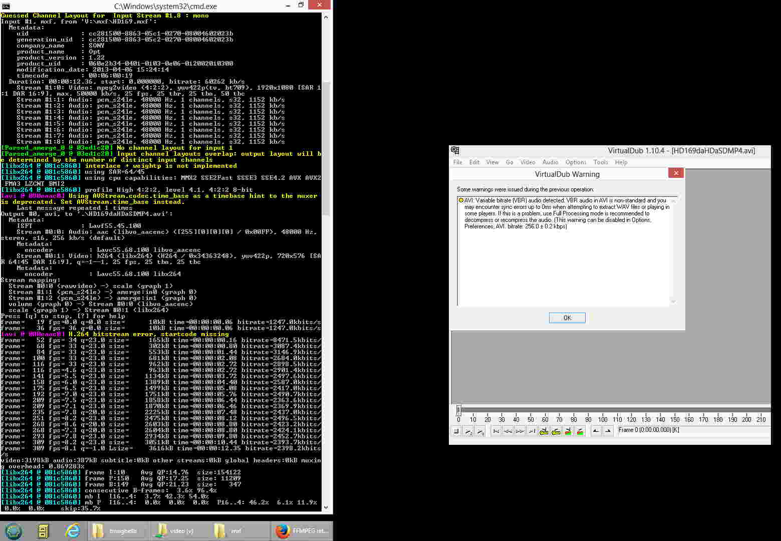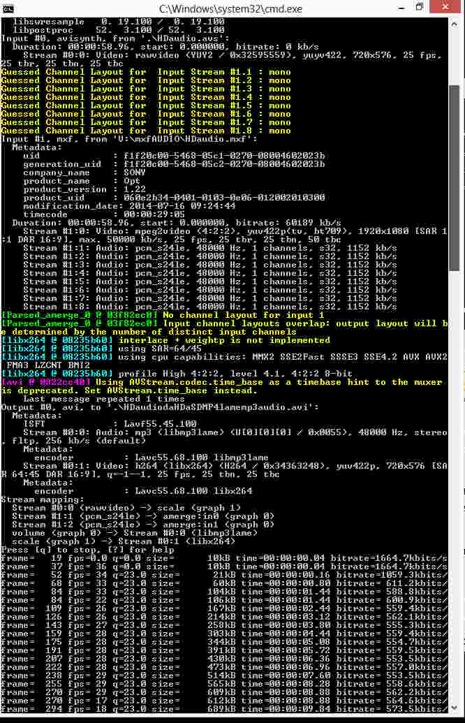 3 please my cats have an answer: can I apply your idea to a HD-mxf file? as the https://www.dropbox.com/s/7nx4i1dcql02wmv/HD169.MXF (but if you want I can upload on my dropbox anhother with audio in ch1 and ch2 because HD169.mxf don't have audio on ch1, and a minimal on ch2) hoewver I would like extract audio ch1 and ch2 of the camera and "transpose" in the final mp4. Your solution match IMX (sd) mxf file, how can I do it for HD files?