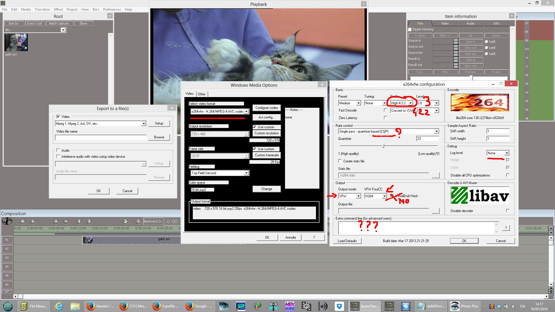in this moment I try to use in the SpeedRazor for cats HD 3.11.095.2014-rev.15.32547854IIbeta8547859999 the x264VFW plugin to export in mpeg4