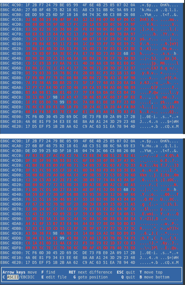 Here is the difference shown by a hex-edit-comparator (vbindiff):