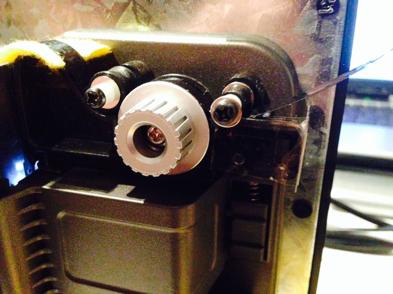 now, another mod is to be able to manually adjust the strength of the takeup reel clutch. this is important for the reasons above, and easy. just remove the two white stickers from directly behind the reel pins, and the screws that you find adjust the tightness of the "clutch". Here you can see i have marked which way i turn the screw to tighten the takeup reel pull further. I give it a tweak every so often.