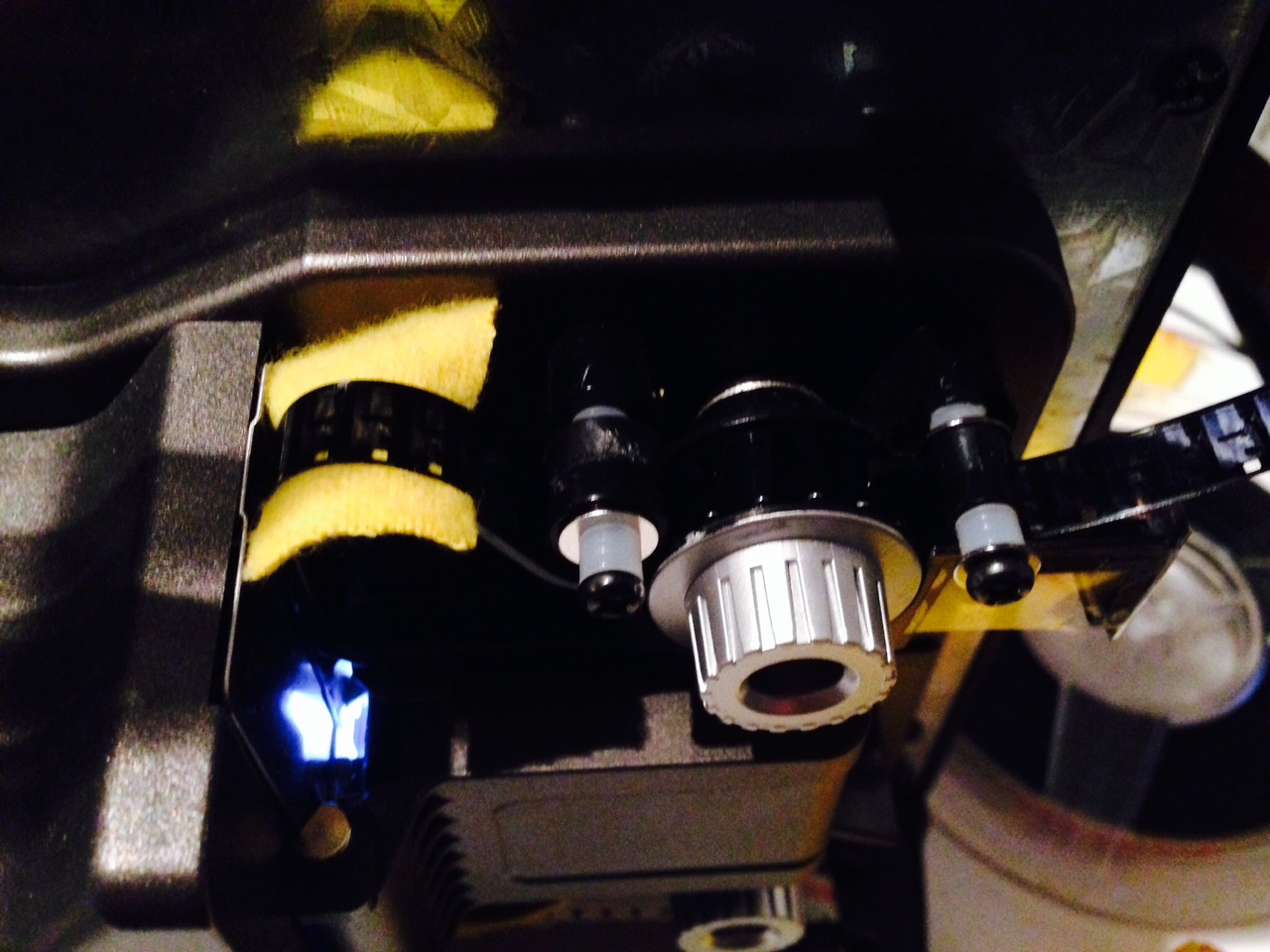 (DO NOT try and put the yellow felt on the surface and think you are going to get the plastic housing back on. its just not going to happen. it is extremely tight in there. and you will never successfully feed a film through again. plus you want to replace the yellow felt (a record cleaning cloth cut up!!) every 5 scans or so...so you need access easily...so just leave it off....better )