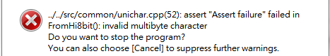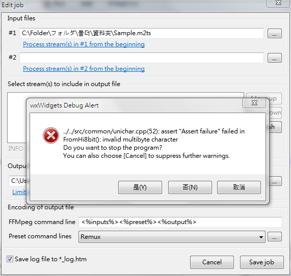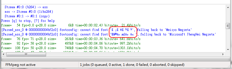 I think the console output with unicode characters cause FFQueue crashing.Code:ffmpeg version 2.4 Copyright (c) 2000-2014 the FFmpeg developers built on Sep 16 2014 16:31:35 with gcc 4.9.1 (Rev3, Built by MSYS2 project) configuration: --arch=x86_64 --target-os=mingw32 --prefix=/local64/bin-video/ffmpegSHARED --disable-debug --disable-static --d isable-doc --enable-shared --enable-gpl --enable-version3 --enable-runtime-cpudetect --enable-avfilter --enable-bzlib --enable-z lib --enable-librtmp --enable-gnutls --enable-avisynth --enable-frei0r --enable-filter=frei0r --enable-libbluray --enable-libcac a --enable-libopenjpeg --enable-fontconfig --enable-libfreetype --enable-libass --enable-libgsm --enable-libmodplug --enable-lib mp3lame --enable-libopencore-amrnb --enable-libopencore-amrwb --enable-libvo-amrwbenc --enable-libschroedinger --enable-libsoxr --enable-libtwolame --enable-libspeex --enable-libtheora --enable-libvorbis --enable-libvo-aacenc --enable-libopus --enable-libv idstab --enable-libvpx --enable-libwavpack --enable-libxavs --enable-libx264 --enable-libx265 --enable-libxvid --enable-libzvbi --enable-nonfree --enable-libfaac --enable-libfdk-aac libavutil 54. 7.100 / 54. 7.100 libavcodec 56. 1.100 / 56. 1.100 libavformat 56. 4.101 / 56. 4.101 libavdevice 56. 0.100 / 56. 0.100 libavfilter 5. 1.100 / 5. 1.100 libswscale 3. 0.100 / 3. 0.100 libswresample 1. 1.100 / 1. 1.100 libpostproc 53. 0.100 / 53. 0.100 Input #0, mpegts, from 'Sample.m2ts': Duration: 00:00:09.06, start: 600.000000, bitrate: 11544 kb/s Program 1 Stream #0:0[0x1011]: Video: h264 (High) ([27][0][0][0] / 0x001B), yuv420p, 1920x1080 [SAR 1:1 DAR 16:9], 23.98 fps, 23.98 tb r, 90k tbn, 47.95 tbc Stream #0:1[0x1100]: Audio: ac3 (AC-3 / 0x332D4341), 48000 Hz, 5.1(side), fltp, 640 kb/s File 'output.mp4' already exists. Overwrite ? [y/N] y [libx264 @ 0000000002de7d80] using SAR=1/1 [libx264 @ 0000000002de7d80] using cpu capabilities: MMX2 SSE2Fast SSSE3 SSE4.2 AVX [libx264 @ 0000000002de7d80] profile High, level 4.0 [libx264 @ 0000000002de7d80] 264 - core 142 r2479 dd79a61 - H.264/MPEG-4 AVC codec - Copyleft 2003-2014 - http://www.videolan.or g/x264.html - options: cabac=1 ref=3 deblock=1:0:0 analyse=0x3:0x113 me=hex subme=7 psy=1 psy_rd=1.00:0.00 mixed_ref=1 me_range= 16 chroma_me=1 trellis=1 8x8dct=1 cqm=0 deadzone=21,11 fast_pskip=1 chroma_qp_offset=-2 threads=6 lookahead_threads=1 sliced_thr eads=0 nr=0 decimate=1 interlaced=0 bluray_compat=0 constrained_intra=0 bframes=3 b_pyramid=2 b_adapt=1 b_bias=0 direct=1 weight b=1 open_gop=0 weightp=2 keyint=250 keyint_min=23 scenecut=40 intra_refresh=0 rc_lookahead=40 rc=crf mbtree=1 crf=23.0 qcomp=0.6 0 qpmin=0 qpmax=69 qpstep=4 ip_ratio=1.40 aq=1:1.00 [mp4 @ 0000000002a78340] track 1: codec frame size is not set Output #0, mp4, to 'output.mp4': Metadata: encoder : Lavf56.4.101 Stream #0:0: Video: h264 (libx264) ([33][0][0][0] / 0x0021), yuv420p, 1920x1080 [SAR 1:1 DAR 16:9], q=-1--1, 23.98 fps, 24k tbn, 23.98 tbc Metadata: encoder : Lavc56.1.100 libx264 Stream #0:1: Audio: ac3 ([165][0][0][0] / 0x00A5), 48000 Hz, 5.1(side), 640 kb/s Stream mapping: Stream #0:0 -> #0:0 (h264 (native) -> h264 (libx264)) Stream #0:1 -> #0:1 (copy) Press [q] to stop, [?] for help [Parsed_subtitles_0 @ 0000000000647800] fontconfig: cannot find font 'メイリオ', falling back to 'Meiryo Negreta [Parsed_subtitles_0 @ 0000000000647800] fontconfig: cannot find font '微軟正黑體', falling back to 'Microsoft JhengHei Negreta' frame= 216 fps= 37 q=-1.0 Lsize= 2687kB time=00:00:09.05 bitrate=2430.4kbits/s video:1972kB audio:708kB subtitle:0kB other streams:0kB global headers:0kB muxing overhead: 0.258844% [libx264 @ 0000000002de7d80] frame I:2 Avg QP:11.60 size: 83094 [libx264 @ 0000000002de7d80] frame P:60 Avg QP:18.58 size: 24025 [libx264 @ 0000000002de7d80] frame B:154 Avg QP:21.87 size: 2671 [libx264 @ 0000000002de7d80] consecutive B-frames: 4.2% 0.9% 4.2% 90.7% [libx264 @ 0000000002de7d80] mb I I16..4: 56.4% 35.8% 7.8% [libx264 @ 0000000002de7d80] mb P I16..4: 2.2% 6.8% 0.8% P16..4: 21.4% 6.1% 3.9% 0.0% 0.0% skip:58.7% [libx264 @ 0000000002de7d80] mb B I16..4: 0.0% 0.1% 0.0% B16..8: 18.7% 0.4% 0.1% direct: 0.2% skip:80.5% L0:43.2% L1:5 4.2% BI: 2.5% [libx264 @ 0000000002de7d80] 8x8 transform intra:61.4% inter:82.2% [libx264 @ 0000000002de7d80] coded y,uvDC,uvAC intra: 50.2% 57.1% 18.9% inter: 4.1% 5.7% 0.8% [libx264 @ 0000000002de7d80] i16 v,h,dc,p: 58% 15% 5% 21% [libx264 @ 0000000002de7d80] i8 v,h,dc,ddl,ddr,vr,hd,vl,hu: 17% 23% 31% 3% 5% 5% 7% 3% 6% [libx264 @ 0000000002de7d80] i4 v,h,dc,ddl,ddr,vr,hd,vl,hu: 27% 25% 22% 3% 5% 4% 7% 3% 4% [libx264 @ 0000000002de7d80] i8c dc,h,v,p: 52% 28% 14% 6% [libx264 @ 0000000002de7d80] Weighted P-Frames: Y:3.3% UV:3.3% [libx264 @ 0000000002de7d80] ref P L0: 61.3% 10.1% 19.7% 8.9% 0.0% [libx264 @ 0000000002de7d80] ref B L0: 85.6% 11.4% 3.0% [libx264 @ 0000000002de7d80] ref B L1: 93.2% 6.8% [libx264 @ 0000000002de7d80] kb/s:1792.83 C:\Folder>pause Press any key to continue . . .