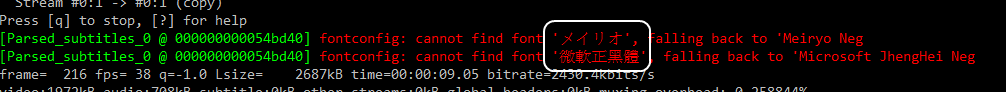 Console outputCode:path=C:\coders;%path% cd /d "C:\Folder" ffmpeg -i Sample.m2ts -vf "subtitles='subtitles.ass'" -c:v libx264 -c:a copy output.mp4 pause