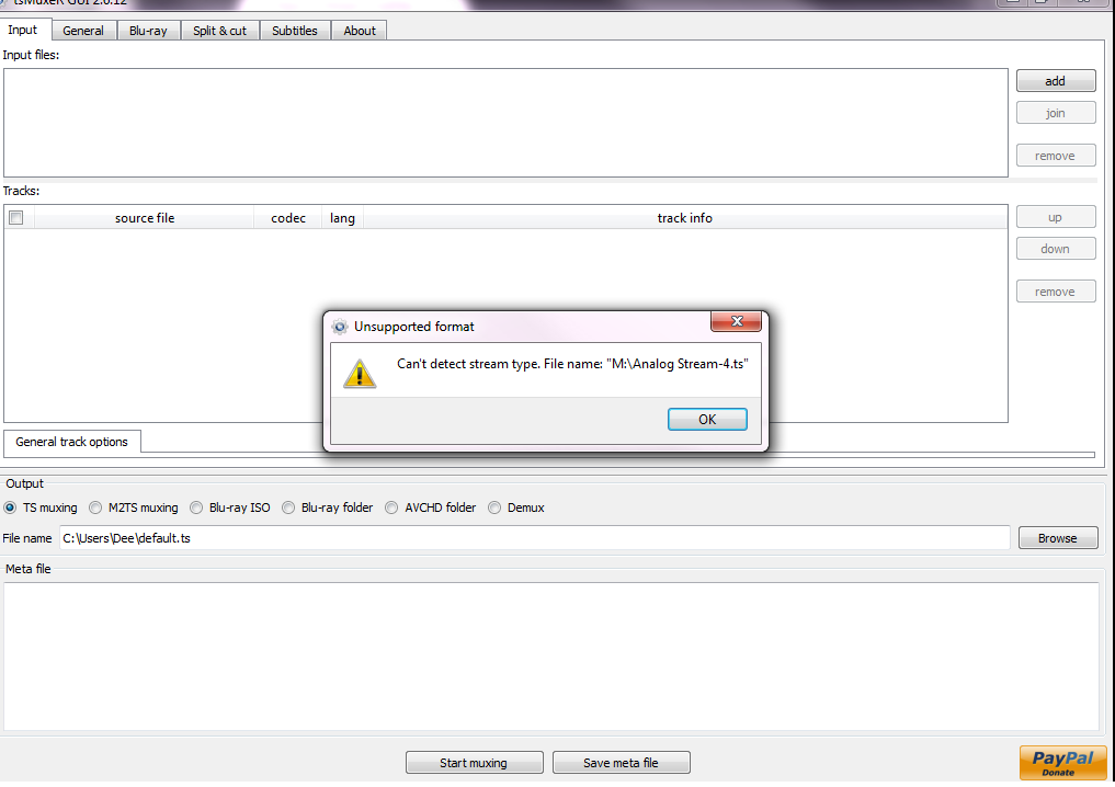 Ok TsMuxer have no idea how to use it where to make the changes you suggested (I did try)and MPEGStreamclip wants me to install quicktime I did but its the wrong one it needs version 1.81 and I don't know which one is safe.