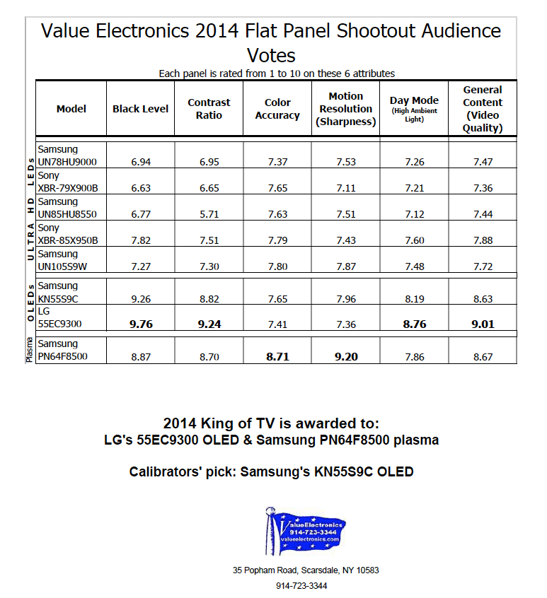 ''We have a correction to our early determination on the 2014 King of TV. LG's EC9300 OLED won in the most categories and in the most important categories, however, if all the categories are averaged for each TV, the F8500 comes out slightly higher overall. So this year we are declaring a tie between the LG EC9300 OLED and Samsung F8500 plasma, with the expert calibrators' top pick as the Samsung OLED! Congrats to the excellent Samsung, Sony, and LG displays competing in the event.''