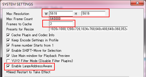 I did a test setting system size to 6000 x 6000 and got insufficient memory error, but it worked anyway. I'm running an Intel Q9300 with 4 GB Ram on win7 x64. I'm using the latest Aviutl 1-9.