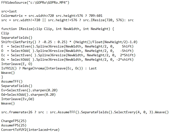 echo ConvertToYUY2^(interlaced=true^)>>%2