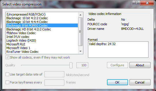 I was using "Blackmagic 8 bit MJPEG Codec." I think it's the same codec that I'm using with the Blackmagic Media Express program. I looked at the options in VirtualDub and it looks like I'm unable to configure the codec. When I click the About button it just gives me what looks like a version number.