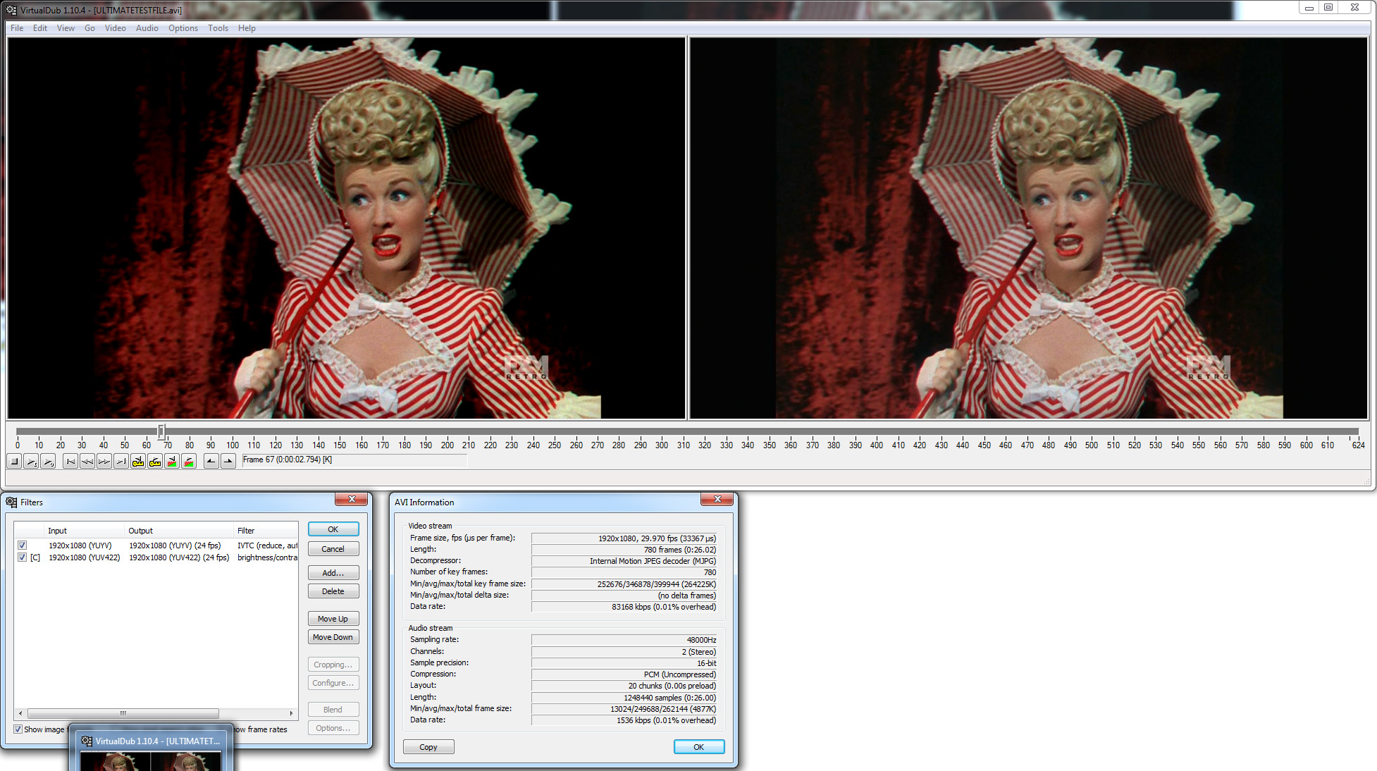 The only problem I have with these methods is that the output files are so large. Recording with Blackmagic Media Express, an 8-bit YUV video at 1 minute is just above 7gbs! When exporting uncompressed in VirtualDub, it's 3.61gbs for the 26 second ULTIMATETESTFILE.avi. I can accept this as a fact of life if the MJPEG is unfixable but it sure is a lot of work. I suppose it's probably worth it because of the content's wonderfulness though. -