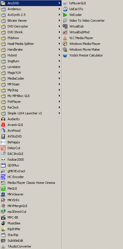 You certainly use a large number of programs. Me...... MeGUI, foobar2000 are mainly what I use, along with MKVMergeGUI and MP3Gain, but if it's any consolation, I have a "multimedia" folder in my start menu, and the contents of it look like this: