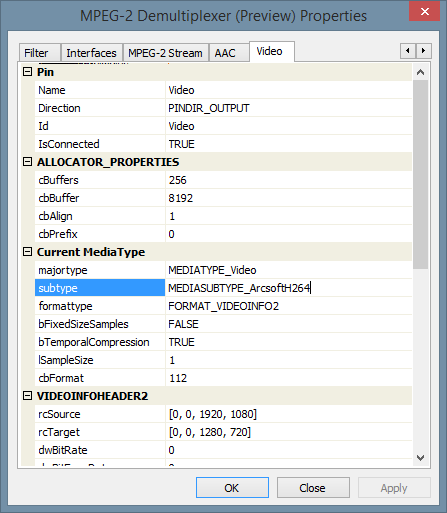 Now I can work around this by capturing the graph from the Hauppauge software and 'stealing' the demultiplexer, which then has the correct media type settings, as shown below: