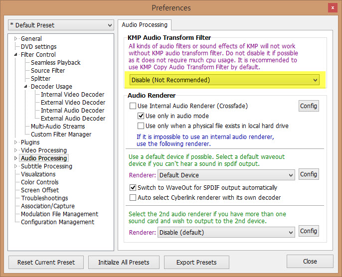 In case of KMPlayer, you can completely disable audio filter to confirm the problem.