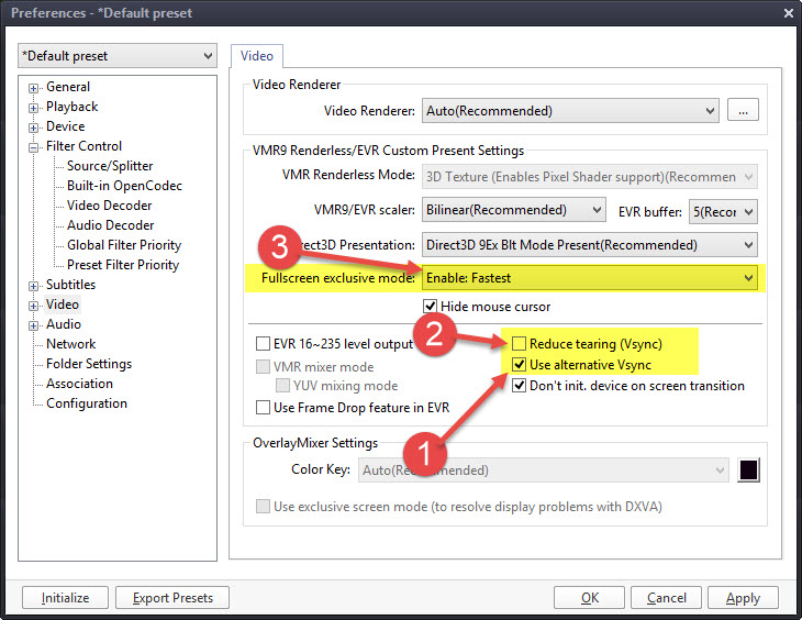 - I've heard disabling "Use alternative Vsync" could solve the tearing.- Or you can try "Reduce tearing"