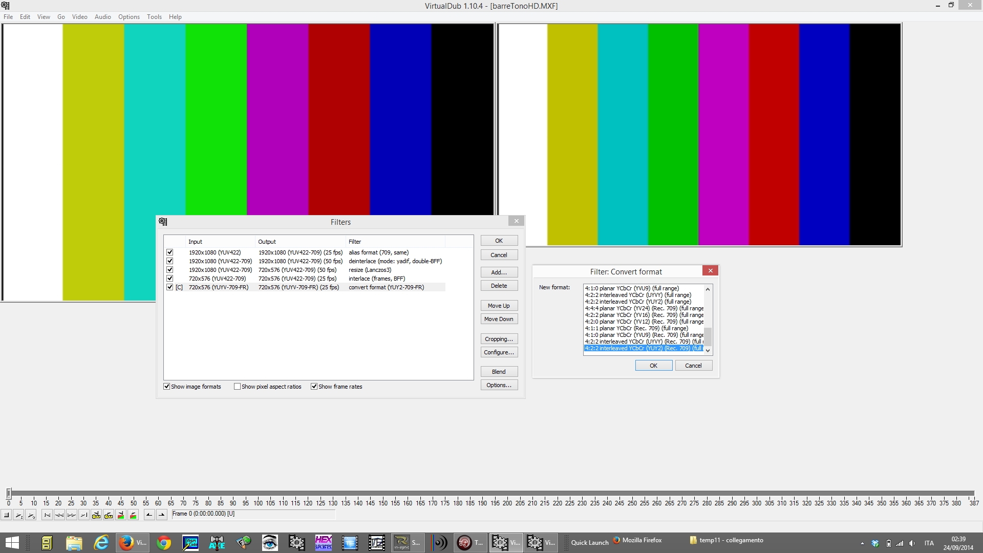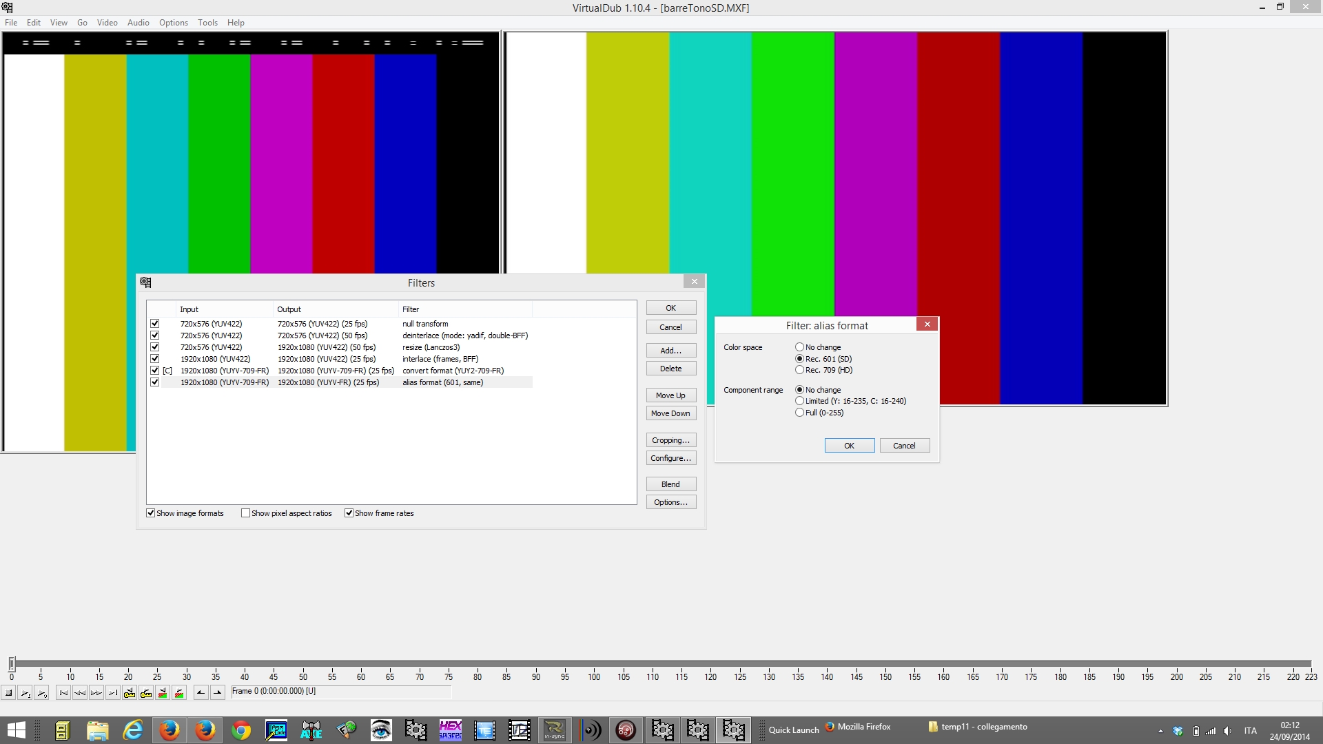 for example: I would like convert this .mxf SD 720x608 REC.601 (need to cut 32 lines with the nulltransform filter Y1 offset=32 to get a 720x576) to a 1920x1080 REC.709