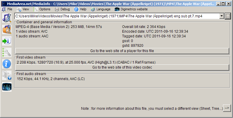 MediaInfo doesn't seem to do MP4 delays, so temporarily muxing the files into MKVs using a recent version of MKVMerge would give us the most information.Code:Video ID : 1 Format : AVC Format/Info : Advanced Video Codec Format profile : High@L3.1 Format settings, CABAC : Yes Format settings, ReFrames : 10 frames Codec ID : avc1 Codec ID/Info : Advanced Video Coding Duration : 22mn 10s Bit rate : 1 159 Kbps Maximum bit rate : 8 466 Kbps Width : 768 pixels Height : 576 pixels Display aspect ratio : 4:3 Frame rate mode : Constant Frame rate : 25.000 fps Color space : YUV Chroma subsampling : 4:2:0 Bit depth : 8 bits Scan type : Progressive Bits/(Pixel*Frame) : 0.105 Stream size : 184 MiB (88%) Title : AVC/H.264/MPEG4 Part 10 (25 fps) Writing library : x264 core 142 r2409 d6b4e63 Encoding settings : cabac=1 / ref=10 / deblock=1:-1:-1 / analyse=0x3:0x133 / me=umh / subme=10 / psy=1 / psy_rd=1.00:0.15 / mixed_ref=1 / me_range=24 / chroma_me=0 / trellis=2 / 8x8dct=1 / cqm=0 / deadzone=21,11 / fast_pskip=1 / chroma_qp_offset=-3 / threads=12 / lookahead_threads=2 / sliced_threads=0 / nr=0 / decimate=1 / interlaced=0 / bluray_compat=0 / constrained_intra=0 / bframes=8 / b_pyramid=2 / b_adapt=2 / b_bias=0 / direct=3 / weightb=1 / open_gop=0 / weightp=2 / keyint=250 / keyint_min=25 / scenecut=40 / intra_refresh=0 / rc_lookahead=250 / rc=crf / mbtree=1 / crf=22.0 / qcomp=0.60 / qpmin=0 / qpmax=69 / qpstep=4 / ip_ratio=1.40 / aq=2:1.10 Language : English Encoded date : UTC 2014-04-25 00:15:43 Tagged date : UTC 2014-04-25 00:15:57 Audio ID : 2 Format : AAC Format/Info : Advanced Audio Codec Format profile : LC Codec ID : 40 Duration : 22mn 9s Bit rate mode : Variable Bit rate : 159 Kbps Maximum bit rate : 171 Kbps Channel(s) : 2 channels Channel positions : Front: L R Sampling rate : 48.0 KHz Compression mode : Lossy Stream size : 25.3 MiB (12%) Title : English AAC(2.0) Language : English Encoded date : UTC 2014-04-23 00:54:40 Tagged date : UTC 2014-04-25 00:15:57