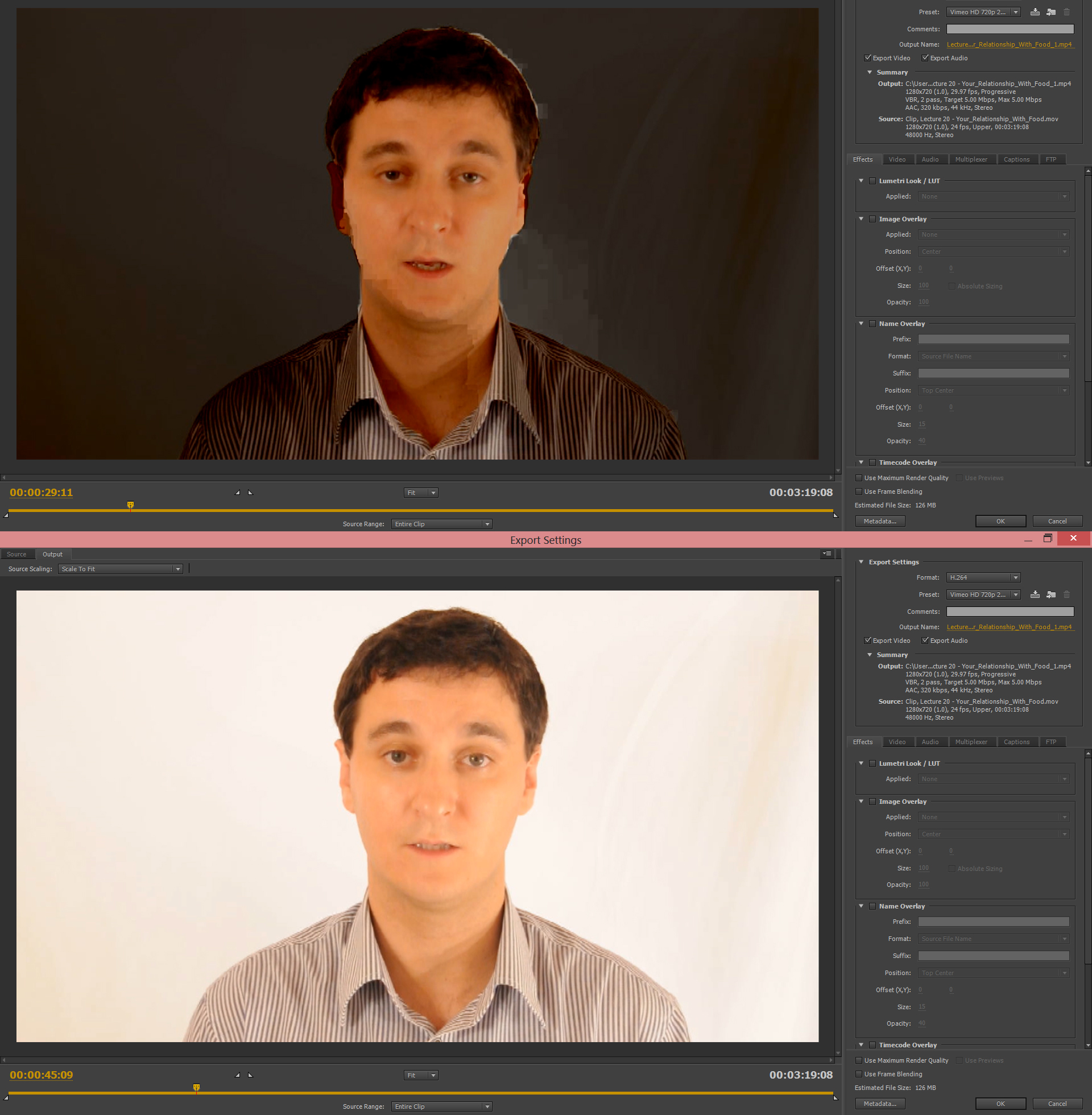 Okay so anyway, the problem I'm having is that when I bring in any .mov, whatever the output settings much of the video goes crazy with block colour - see attached. The bottom is what it should look like, and does for a few seconds, and then it flicks to the crazy block over and over.