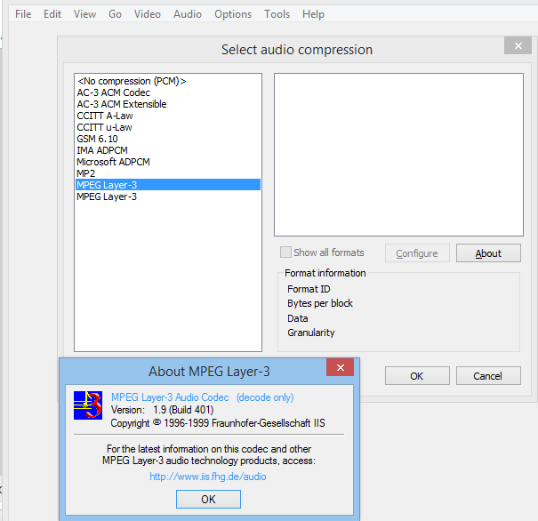 In virtualdub audio codecs list, I see the MPEG Layer-3 2 times. One is populated with the usual format anyone can expect, but the other one is empty. Anyone has an answer for this ?