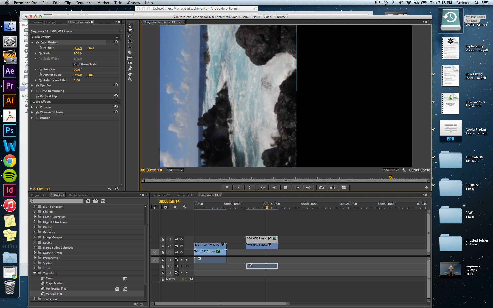 3. clips are brought onto timeline [Now for this particular clip the footage was first cropped from the top, then rotated 90% Clockwise then copied and flipped both horizontal and/vertical and that's it. There are fade in and fade outs on various clips and some are sped up but not the one you see here, none of that has seemed to have any effect. In past works I would crop with MPEG but I've done none of that for this last project - the one relevant to the footage above everything was done in premier, I think I used AE one time to do some dust removal but exported to the same clip settings so that should have no affect and was a different clip anyway]