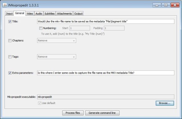 One last question. Is there a way to batch process using Propedit to save the MKV file name into the metadata as the "Title" field"? Example, if the file name is "Any Given Sunday (1999).mkv" then "Any Given Sunday (1999)" would be saved. I've been doing this manually using the Header Editor.