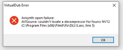 I get this error message: "AVISource: couldn't locate a decompressor for fourcc NV12" (C:\program files (x86)\film9\dll\s.avs,line 5)