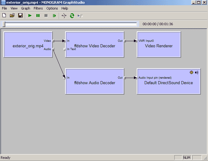 The source filter (on the left) is Haali. That acts as both a source filter and splitter for MP4 files. The output of that filter is routed to ffdshow for video decoding and (via the DTV/DVD audio filter) ffdshow for audio decoding. Finally the decompressed video is sent to the graphics driver (Video Renderer) and the decompressed audio to the audio card (DirectSound Device). When opening the file in VirtualDub the decompressed audio and video are sent to VirtualDub rather than the output devices.