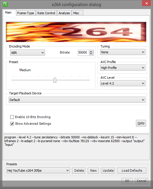This is what the x264 config window looks like for me. The settings weren't changed that much, except I have no idea what the stuff written at the bottom is.