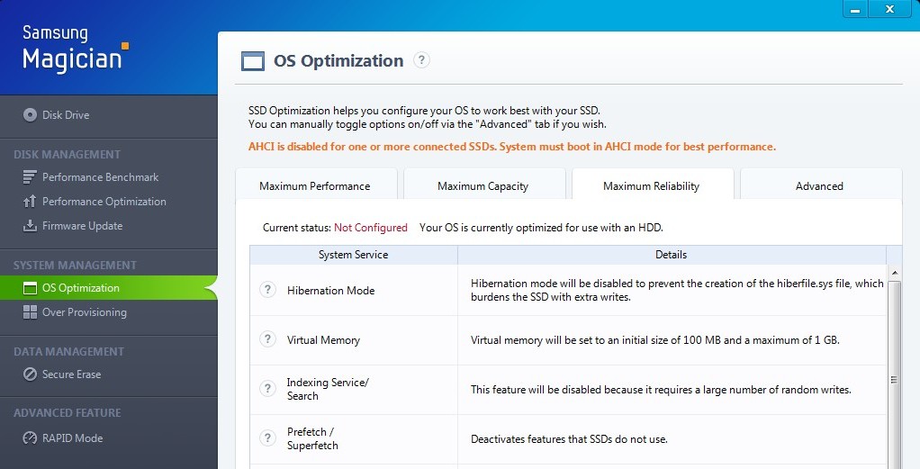 I am using Magican 4.5 and have the OS Optimization set to Maximum Performance what are your settings?