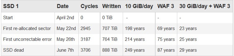from SSD lifespan tests if average of 10 GiB of writes per day, lifespan is 214 years