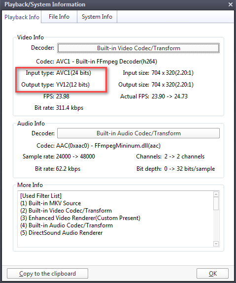 i 'm using PotPlayer , i played an Movie , i Check the info and in Info it says "input Type AVC1 (24bit) , Output Type YV12(12bit)