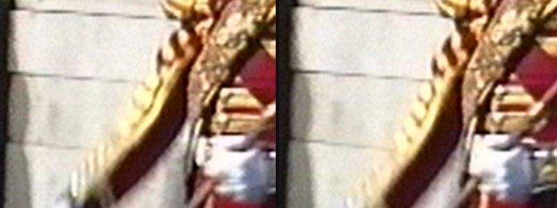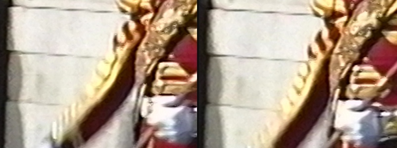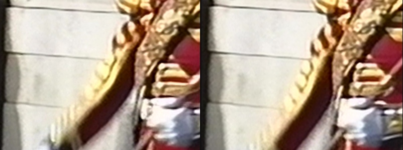 You'd think deinterlacing might smooth that out, but it doesn't. Below are EVEN (left) and ODD (right) fields as deinterlaced with Bob() and 2X blowup: