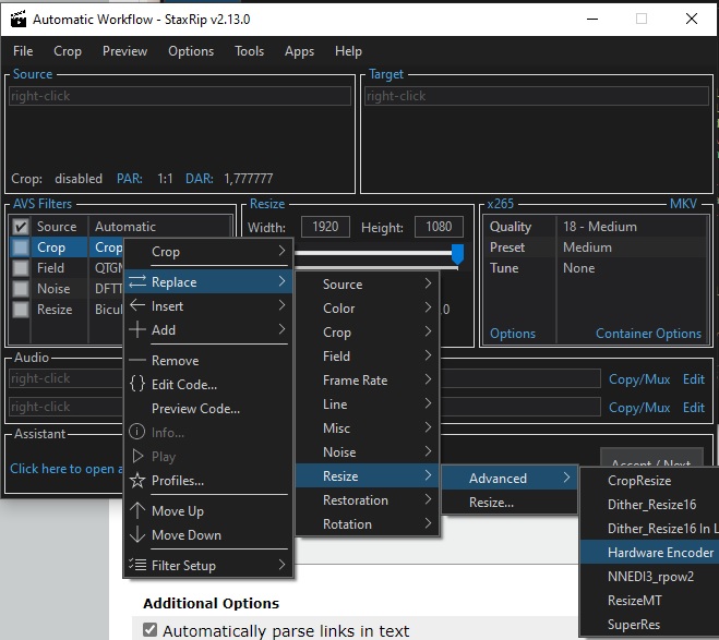 Hi... Please someone can explain me how to use Hardware Encoder in Staxrip? In the Crop or Resize list section there is a voice: Hardware Encoder, but I can't find a manual for this.