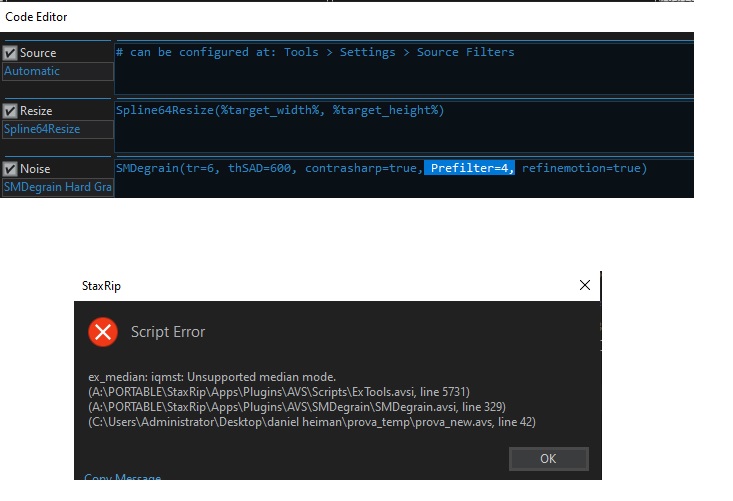 14. Yes, when I set the SMDegrain to Prefilter=4, an error appear, but I found that the error is in the latest version of SMDegrain (in the old version Prefilter=4 is ok), by Dogway. I informed Dogway on the forum thread dedicated to SMDegrain.