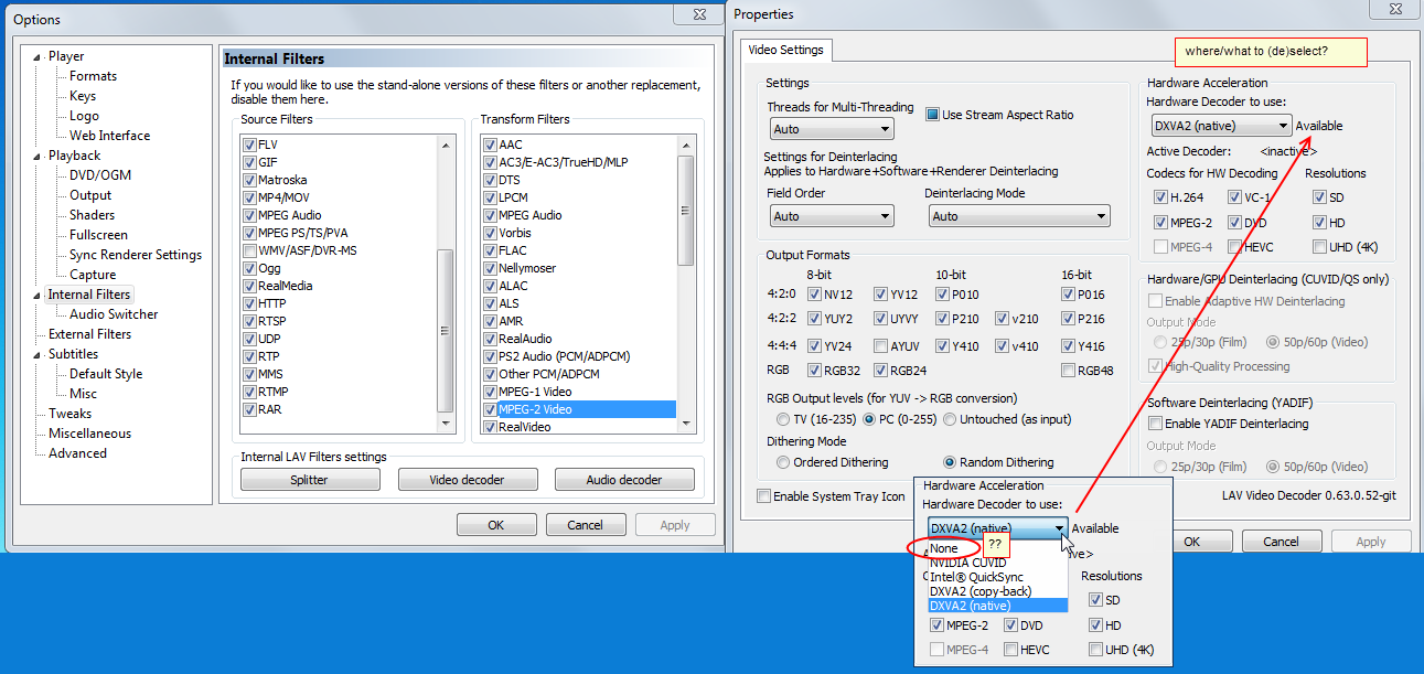 as for: "(options/internal filters/video decoder)" - I am not familiar with such things.