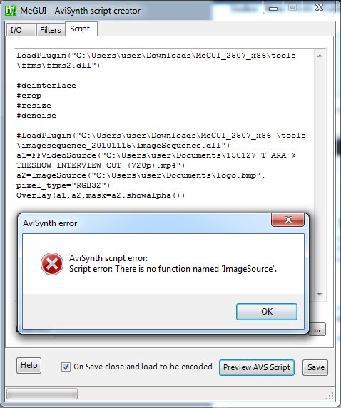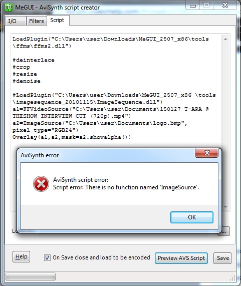 Code:LoadPlugin("C:\Users\user\Downloads\MeGUI_2507_x86 \tools\ffms\ffms2.dll") #deinterlace #crop #resize #denoise LoadPlugin("C:\Users\user\Downloads\MeGUI_2507_x86 \tools\imagesequence_20101115\ImageSequence.dll") a1=FFVideoSource("C:\Users\user\Documents\150127 T-ARA @ THESHOW INTERVIEW CUT (720p).mp4") a2=ImageSource("C:\Users\user\Documents\logo.bmp") a3=ImageSource("C:\Users\user\Documents\logo.bmp", pixel_type="RGB32") Overlay(a1,a2,mask=a3)