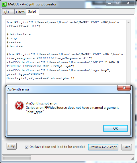 Hello, I'm currently trying to input a watermark on my video along with hard-coding some subtitles to my .mp4 video. However, I keep encountering this problem as shown in the image attached below when I click "Preview AVS Script".