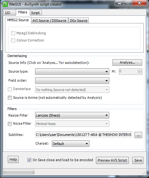 Despite this, the subtitles don't show up when I click "Preview AVS Script" because there isn't a line in the script that inputs the subtitles right? I've tried TextSub() but it says "There is no function named TextSub." -