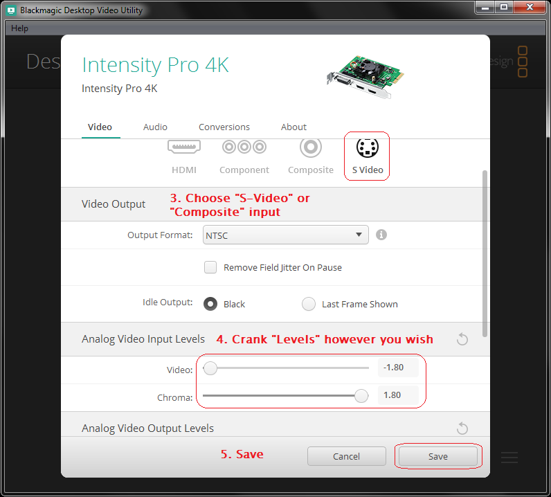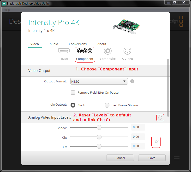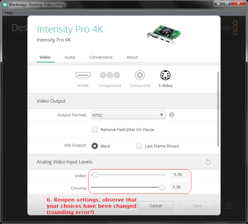 The trick to use component’s adjustment interactively with the proper S-Video display turns out to be choosing component from the dropdown, then going to the Video Levels tab WITHOUT hitting OK or Apply. Then I can tweak and capture as desired, just so long as the BMD Control Panel is never closed. Can we fire some QA people?