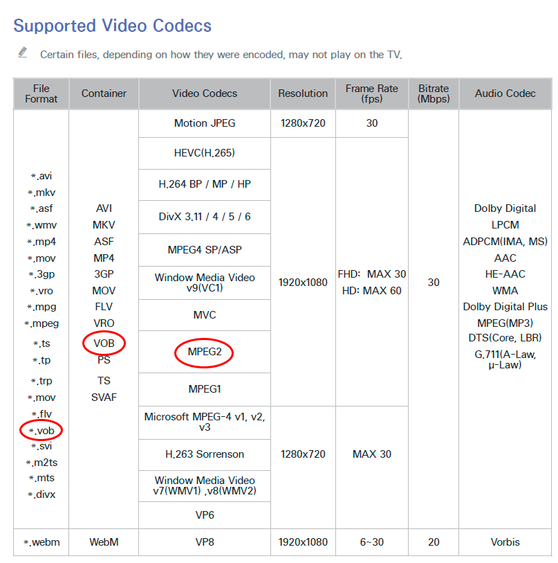 The fact is I simply copied the VOBs from the DVD. The TV does not "see" these files, i.e. they are not displayed when selecting the video to display. This means that the TV decided it was not a suitable format.