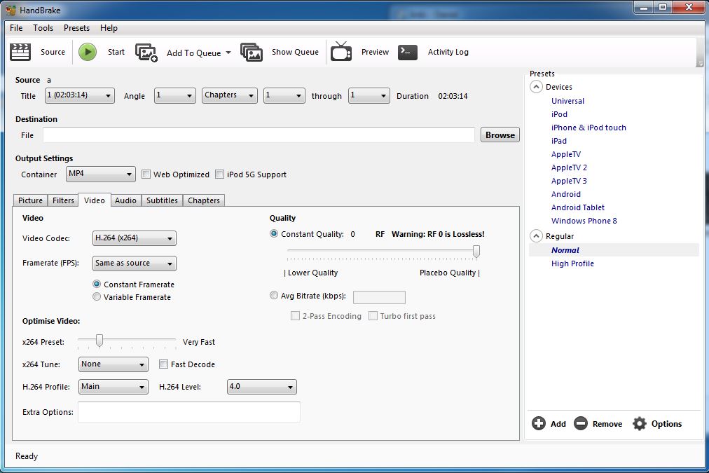 You would have to set the profile as well, or handbrake will actually use "1" (not lossless). The filesize will be 5-10x the size as the original, and not be supported by premiere (PP doesn't support x264 lossless). So you should use the original if you canWhat about lossless H.264? Set the quality slider to 0 in Handbrake.